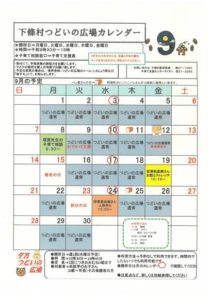 9月つどいの広場カレンダー